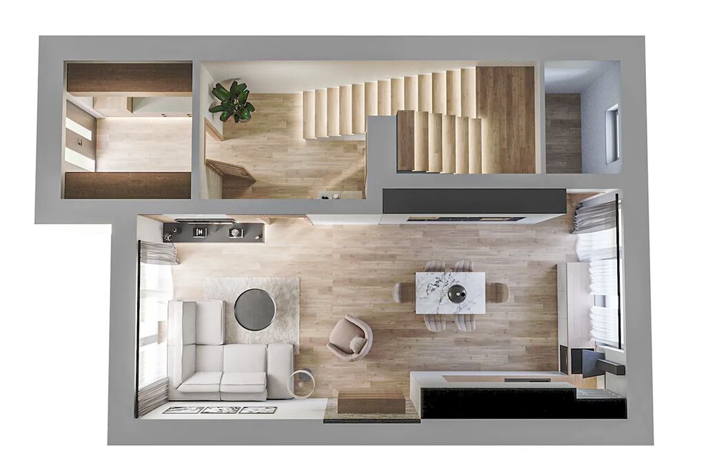 Dispozičně je dům řešen velmi prakticky a prostorně. Nabízí komfortní dispozici 4+kk, která je ideální pro rodinu s dětmi. V přízemí se nachází obývací prostor s kuchyňským koutem a přímým vstupem na zahradu před domem i za domem, technická místnost a toaleta. V patře najdete tři samostatné pokoje a koupelnu.