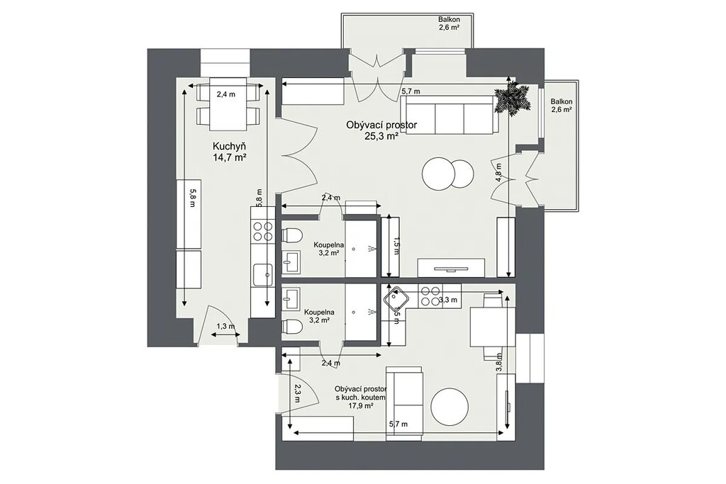 • Balkony: 2 × 2,6 m², celkem 5,2 m²
