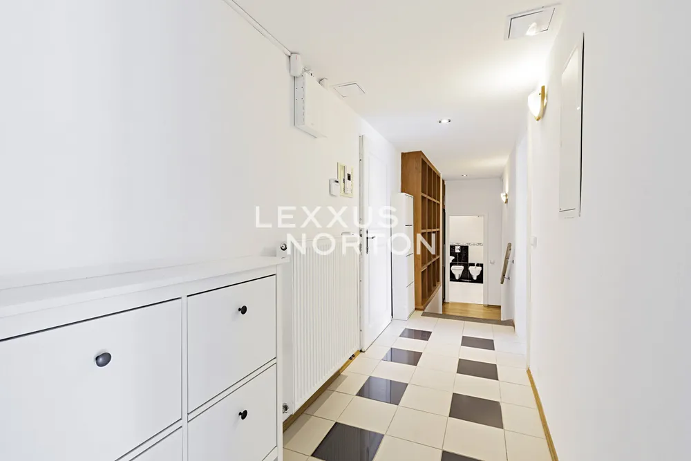 Tento byt k pronájmu dispozičně nabízí vstupní chodbu se 2 šatnami, prostorný obývací pokoj s posuvnými dveřmi vedoucí do plně vybavené kuchyně s jídelní částí, samostatnou ložnici a 2 koupelny. K bytu náleží parkovací stání a sklep. Možnost užívání společné zahrady.
