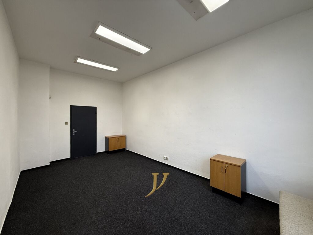 Kancelář má velká plastová okna, která zajišťují dostatek klidu a výhled do zeleně přilehlého parku. Prostor je nově vybaven kobercem. Na patře se nachází dámské a pánské toalety a základně vybavená kuchyňka, kterou mohou nájemci pohodlně využívat.