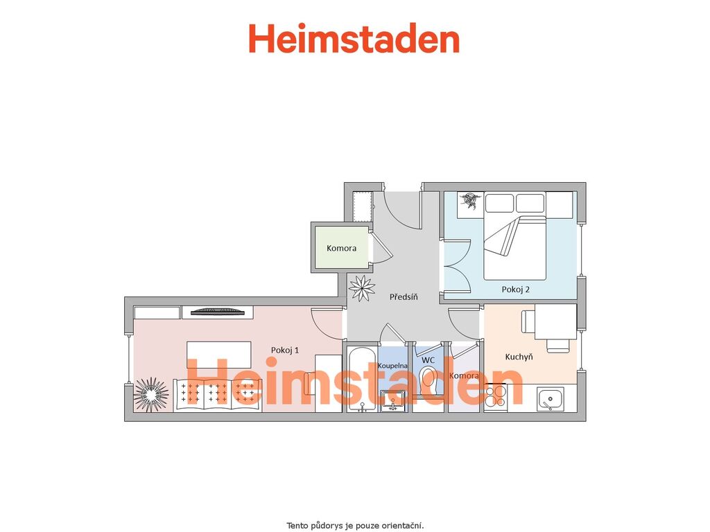 Byt nabízí dva neprůchozí, příjemně světlé pokoje orientované na dvě světové strany, což zajišťuje snadné větrání i příjemnou atmosféru po celý den. Kuchyně čtvercového tvaru poskytne dostatek prostoru pro vaření i stolování a navíc k ní náleží praktická komora s přípojkou na pračku.