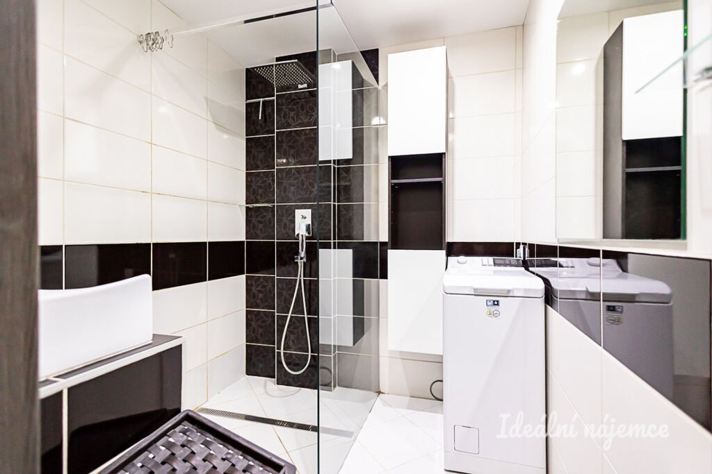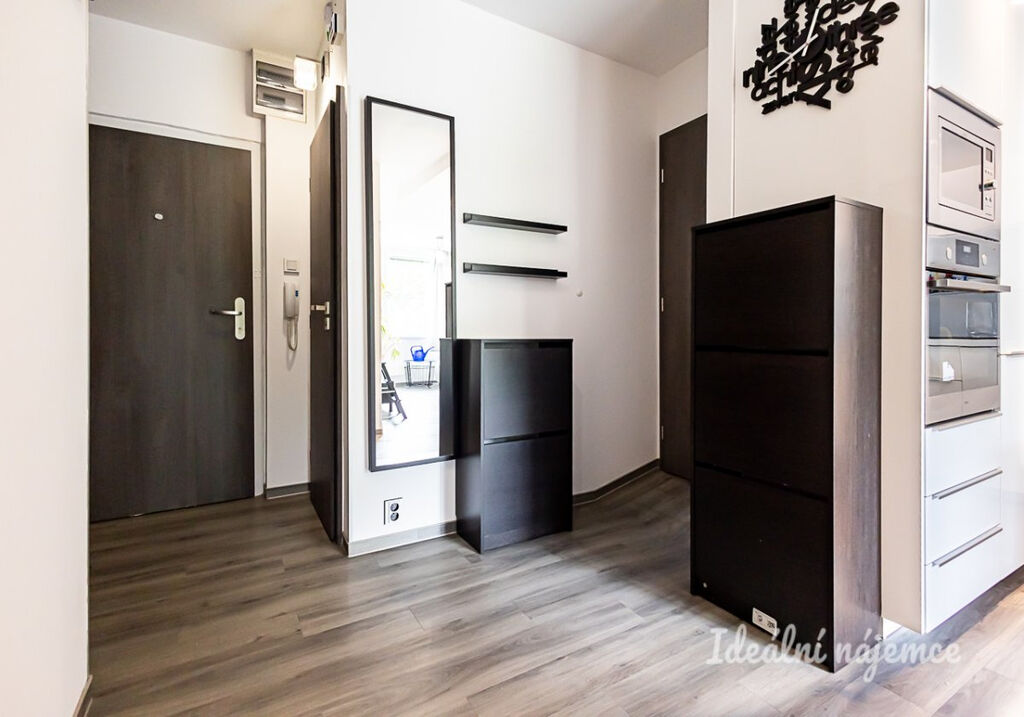 Byt se nabízí plně vybavený. V obývacím pokoji jsou stůl a židle, gauč, TV nábytek a skříňky. Kuchyňský kout, který je spojen s obývacím pokojem disponuje lednicí s mrazákem, myčkou, el. troubou s varnou deskou, digestoří a mikrovlnnou troubou. V ložnici je velká vestavěná skříň. V koupelně je sprchový kout, zrcadlo, umyvadlo, pračka a drobný koupelnový nábytek. WC je zvlášť. V předsíni najdeme věšáky a botníky. V bytě je plovoucí podlaha, závěsy a světla. V bytě je také komora.