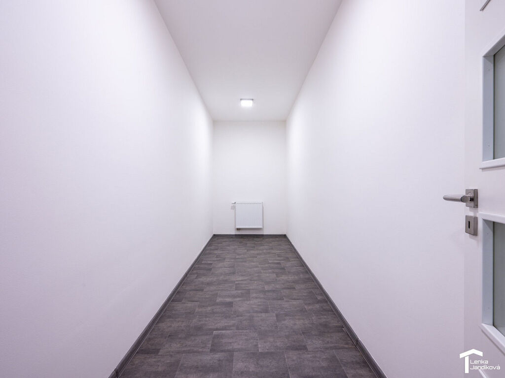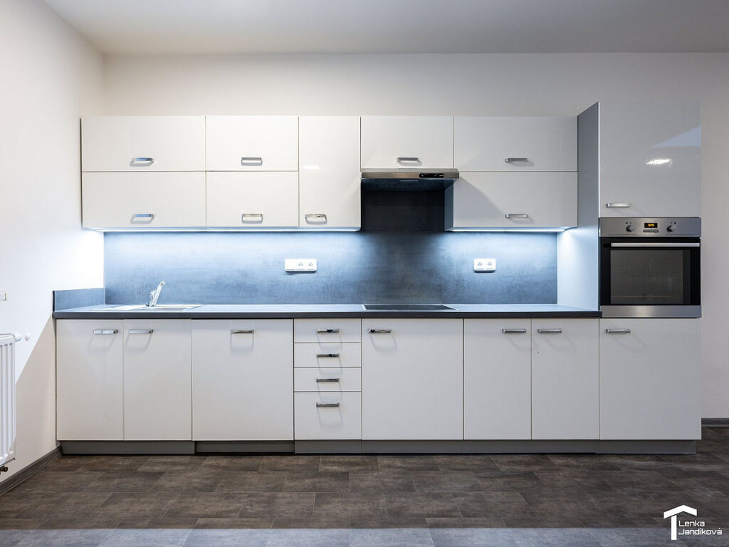 Po vstupu do bytu se ocitáme v prostorné chodbě, ze které jsou samostatné vstupy do pokojů a dále do koupelny a na WC. Na prostornou ložnici navazuje šatna. Koupelna je osazena vanou, je zde přípojka na pračku a WC je samostatné. Obývací pokoj je spojený s kuchyňským koutem. Kuchyňská linka má zabudovanou elektrickou troubu a varnou desku. Z obývacího pokoje je vstup na balkón.
