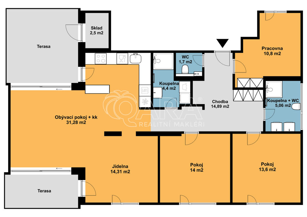 Byt tvoří prostorný obývací pokoj s jídelnou (45,59 m²), dvě samostatné ložnice (14 m² a 13,6 m²), další pokoj/pracovna (10,8 m²), předsíň (14,89 m²), koupelna s vanou (4,4 m²), druhá koupelna se sprchou a WC (5,06 m²) a samostatné WC (1,7 m²).