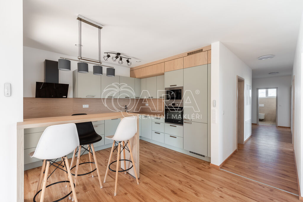 Byt je vybaven moderní kuchyňskou linkou se spotřebiči (varná deska, trouba, myčka, lednice s mrazákem), dvěma vestavěnými skříněmi v předsíni, vinylovými podlahami, předokenními žaluziemi a systémem rekuperace. V bytě je rozveden vysokorychlostní internet.