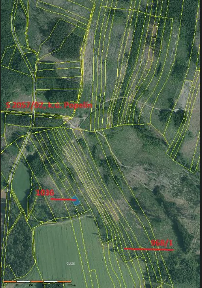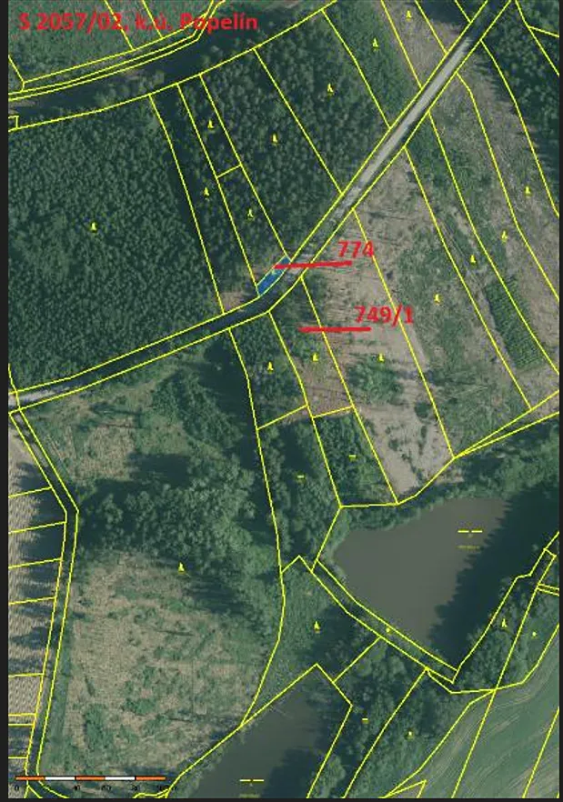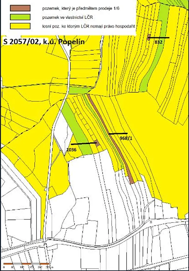 Jedná se o prodej spoluvlastnického podílu o velikosti Id. 1/6 k celku 5 lesních pozemků (p.č. 749/1, 774, 832, 968/1, 1036) menší výměry, pozemky jsou z velké části bez lesního porostu, na malé části výměry se nachází vrby, břízy a několik borovic a smrků. Celková výměra pozemků činí 10176 m2, výměra odpovídající spoluvlastnickému podílu Id. 1/6 z celku 5 pozemků činí 1696 m2.