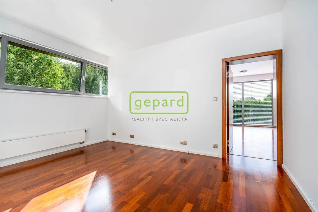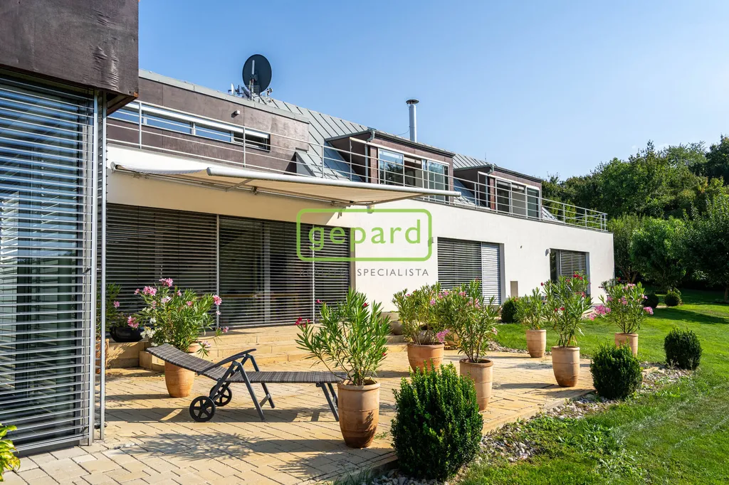 Z horních místností, včetně velké koupelny jsou vstupy na západně orientovanou terasu s otevřeným výhledem do okolní krajiny.