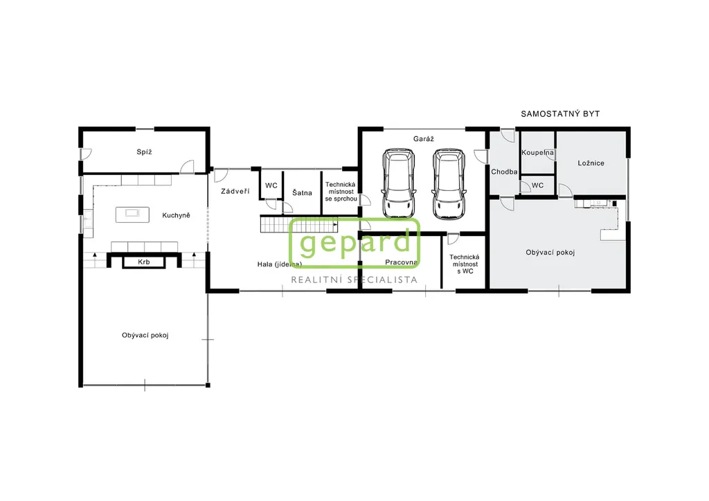 Dispozičně, v přízemí, je v pravé části domu obývací pokoj s panoramatickým výhledem do zahrady, krbem, propojený s kuchyní. Kuchyň je vybavena spotřebiči Miele, Dornbrach a Gutmann a vlastní chlazenou spíží. Navazuje na jídelnu, pracovnu, dále na šatnu a sociální zázemí. Levá část domu, je oddělena garáží pro dva automobily, má vlastní vstup do samostatného bytu s obývacím pokojem s kuchyní, ložnicí a sociálním zázemím.