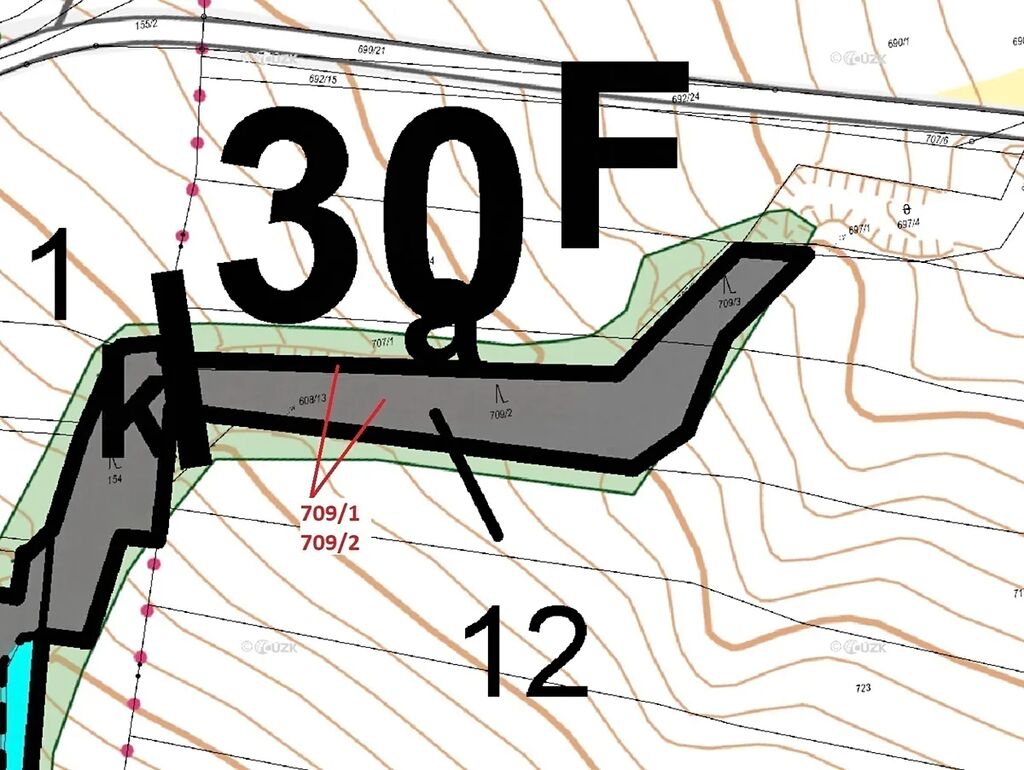 Lesní pozemky o výměře 1823 m2, parcelní čísla 709/1, 709/2, podíl 1/1, katastrální území Jemnice u Oseka, obec Osek, obec s rozšířenou působností Strakonice, okres Strakonice, Jihočeský kraj. Po těžbě.
