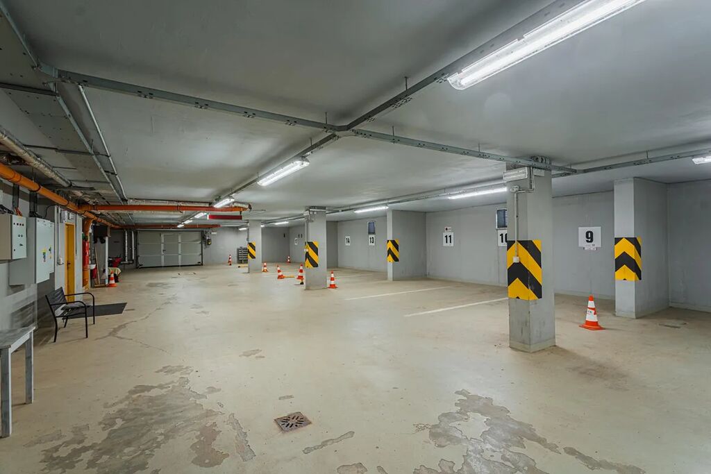K bytu náleží nadstadardní sklepní kóje (vzniklá spojením dvou sklepů) k úschově lyží, kol či dětských kočárků. K apartmánu patří také soukromé parkovací stání v garáži pod domem. V případě zájmu je možné dokoupit i druhé parkovací stání před domem.