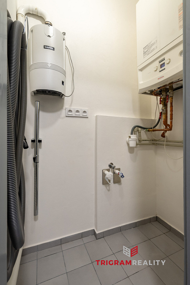 Na koupelnu navazuje technická místnost s plynovým kotlem pro vytápění radiátory i podlahovým systémem a ohřev vody. Součástí je centrální vysavač a přípojka na pračku.