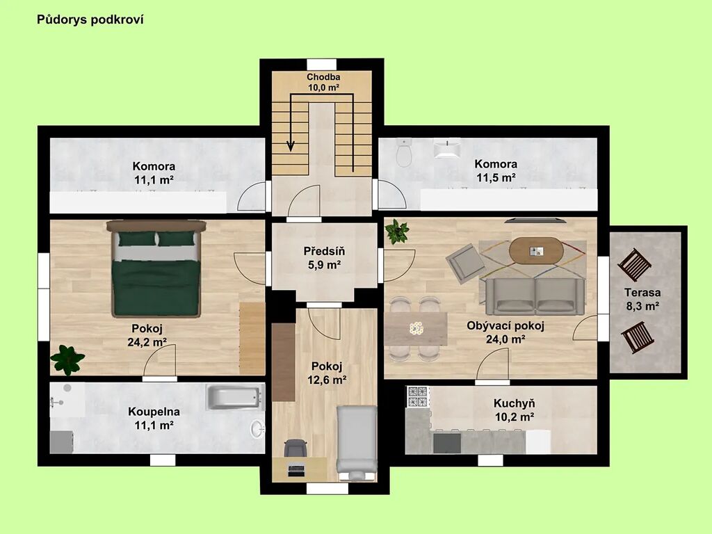 Částečné podsklepení nabízí další úložné prostory nebo možnost technického zázemí.
