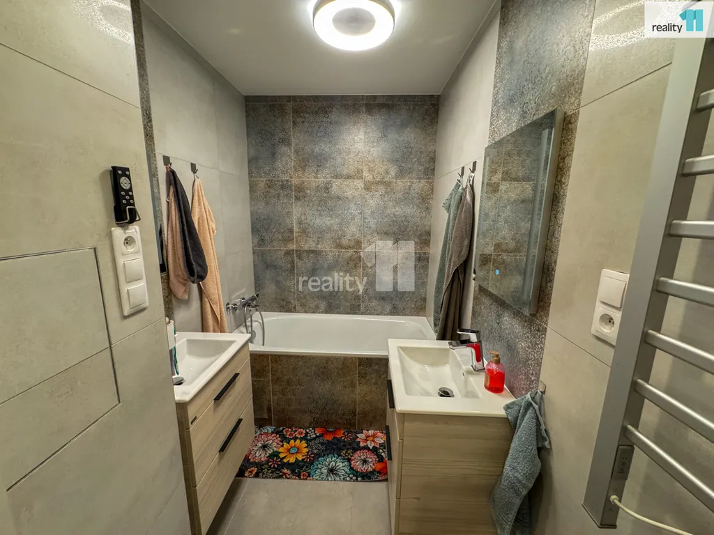 Kuchyně, obývací pokoj, pokoj, ložnice se vstupem na lodžii o výměře 5m², chodba se vstupem do šatny, samostatné WC a koupelna se dvěma umyvadly a vanou. V mezipatře je k dispozici také komora o výměře 1,5m².