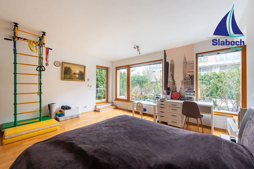 Bytová jednotka se nachází v přízemí třípatrového moderního cihlového domu s výtahem, v bytě dominuje obývací pokoj (27m2) s kuchyňským koutem včetně kuchyňské linky se spotřebiči a se vstupem na vlastní prostornou zahradu (131m2) s terasou, dětský pokoj (24m2), ložnice (15m2) taktéž se vstupem na zahradu a terasu, skvěle řešená chodba (14m2) využitá jako pracovna, koupelna (8m2) s toaletou a místem na pračku a sušičku, komora či šatna (4m2), předsíň (6m2) a další samostatná toaleta (2m2). Na podlaze kvalitní dřevěné podlahy a dlažba, francouzká dřevěná okna díky nímž je byt světlý.