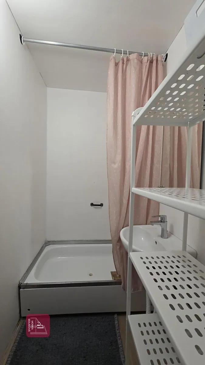 Předsíň je vybavena vestavěnou skříní, botníkem, pračkou a ledničkou s mrzákem. Novější elektrické rozvody. Koupelna se sprchovým koutem a umyvadlem a samostatná toaleta jsou ve standartním vybavení. V pokoji je umístěna moderní kuchyňská linka se spotřebiči (varná deska, el. trouba, digestoř a dřez). Vyšší barový stůl, dvě židle, police, TV, skříňka pod TV, dvojpostel, policový systém, křeslo a šatní skříň.