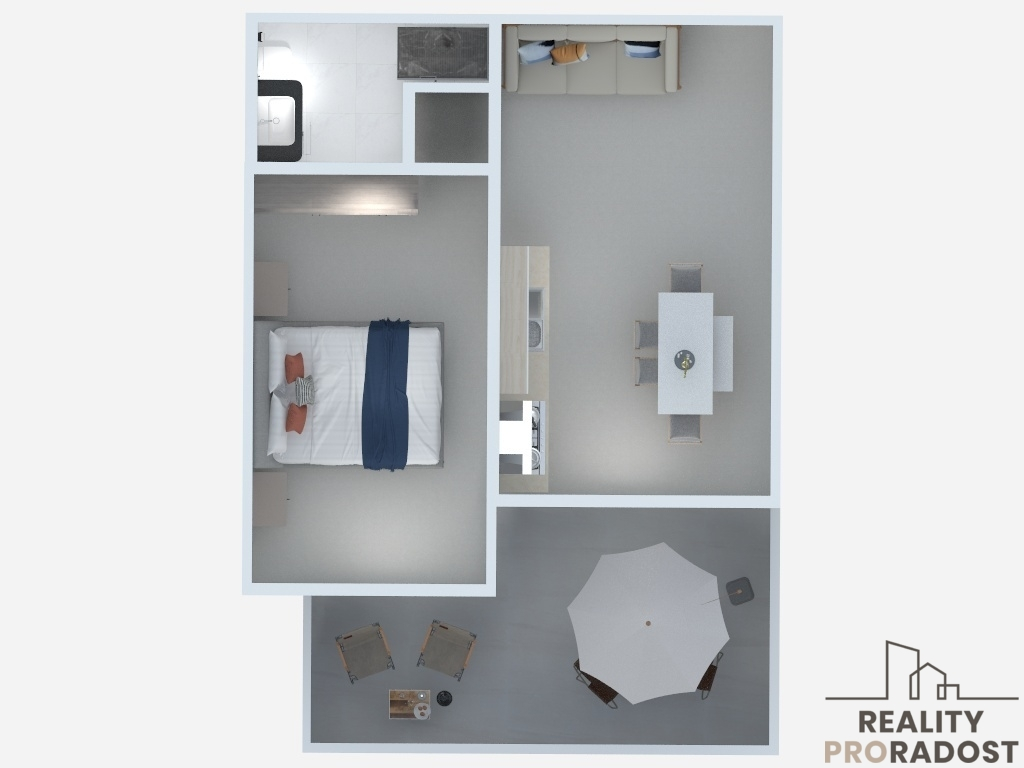 Po vstupu vás přivítá světlý obývací pokoj s přímým vstupem na prostornou terasu, která nabízí příjemné venkovní posezení a klidné prostředí ideální k odpočinku.