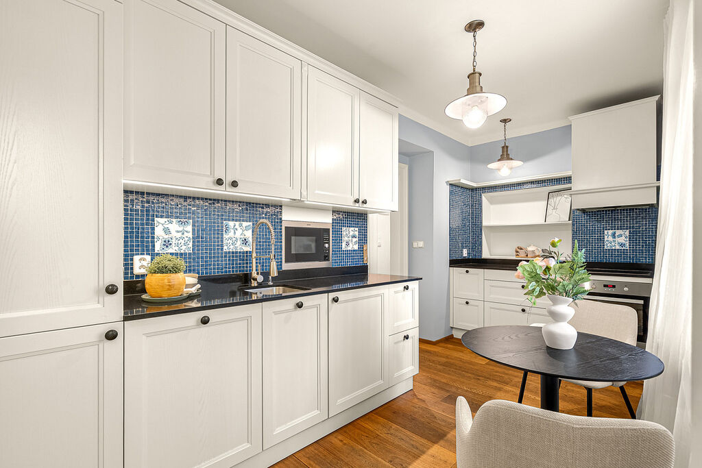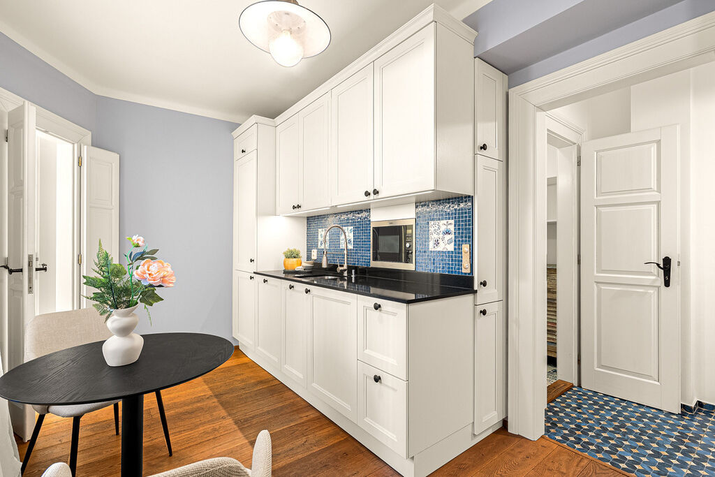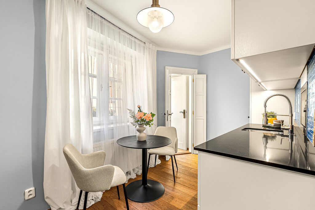 Byt se nachází ve 2. patře a prošel kompletní rekonstrukcí v roce 2014 – od dřevěných oken, přes masivní dubové podlahy až po ručně vyráběné interiérové dveře a bezpečnostní vstupní dveře na míru. Dominantou bytu je kuchyně s jídelním koutem, vyrobená na míru německou značkou Schüller. Masivní skříňky, černá žulová pracovní deska a důraz na detail dělají z kuchyně místo, kde se dá vařit každý den i dlouho sedět s přáteli.