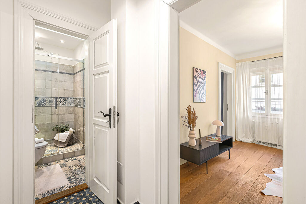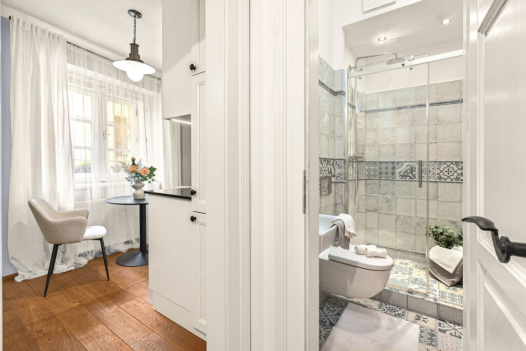 Na kuchyni navazuje obývací pokoj a útulná ložnice. Koupelna se sprchovým koutem působí jako malé boutique spa – kombinace kvalitních materiálů a promyšleného provedení dodává prostoru klid a eleganci.