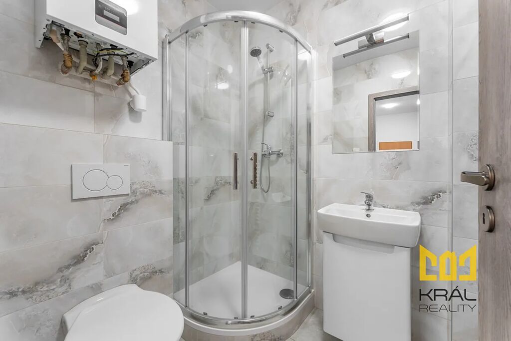 Koupelna se sprchovým koutem, toaletou, umyvadlem, topným tělesem a plynovým kotlem.