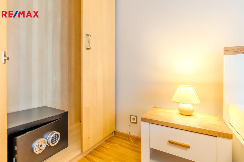 moderní kuchyňská linka se spotřebiči (indukce, trouba, mikrovlnná trouba, myčka, lednice s mrazákem), sušička, pračka. V bytě jsou dvě pohovky, konferenční stolek a další nábytek, který je součástí bytu, ale po dohodě může být odstraněn dle preferencí nájemníka.