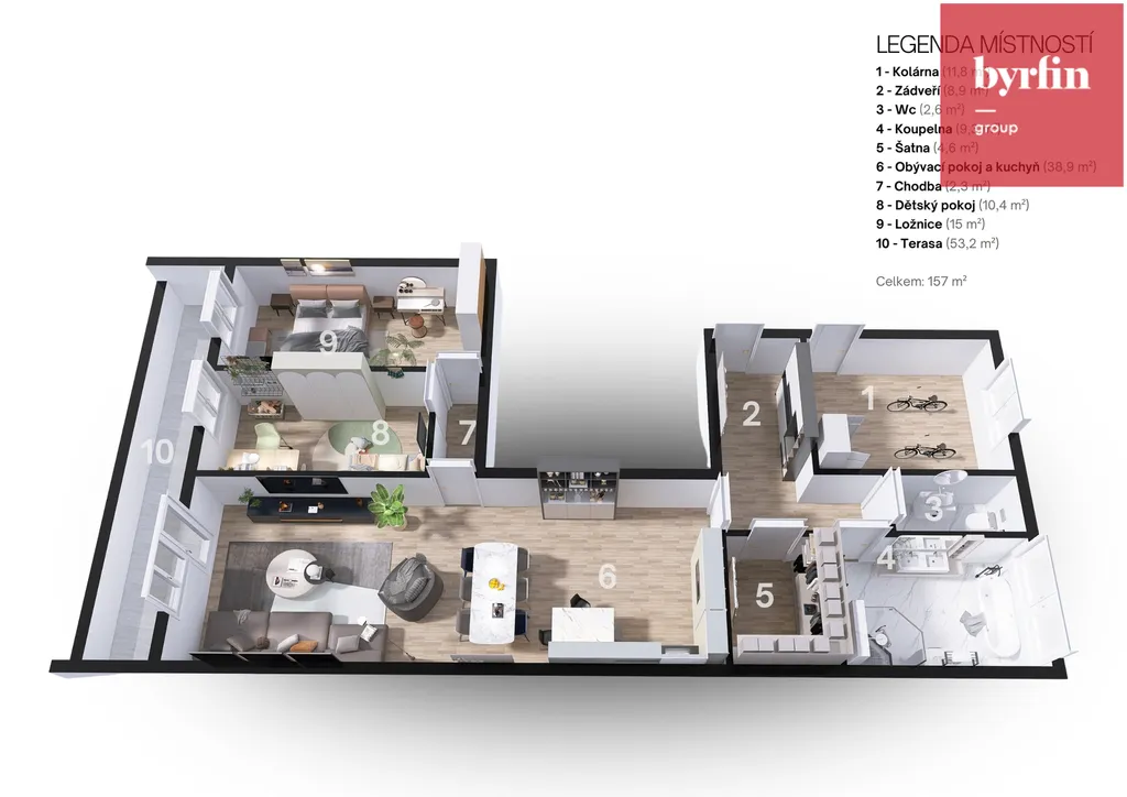 1. NP: Jeden prostorný byt 3+kk o velikosti 96 m² se soukromou zahradou 49 m² a vlastní terasou.