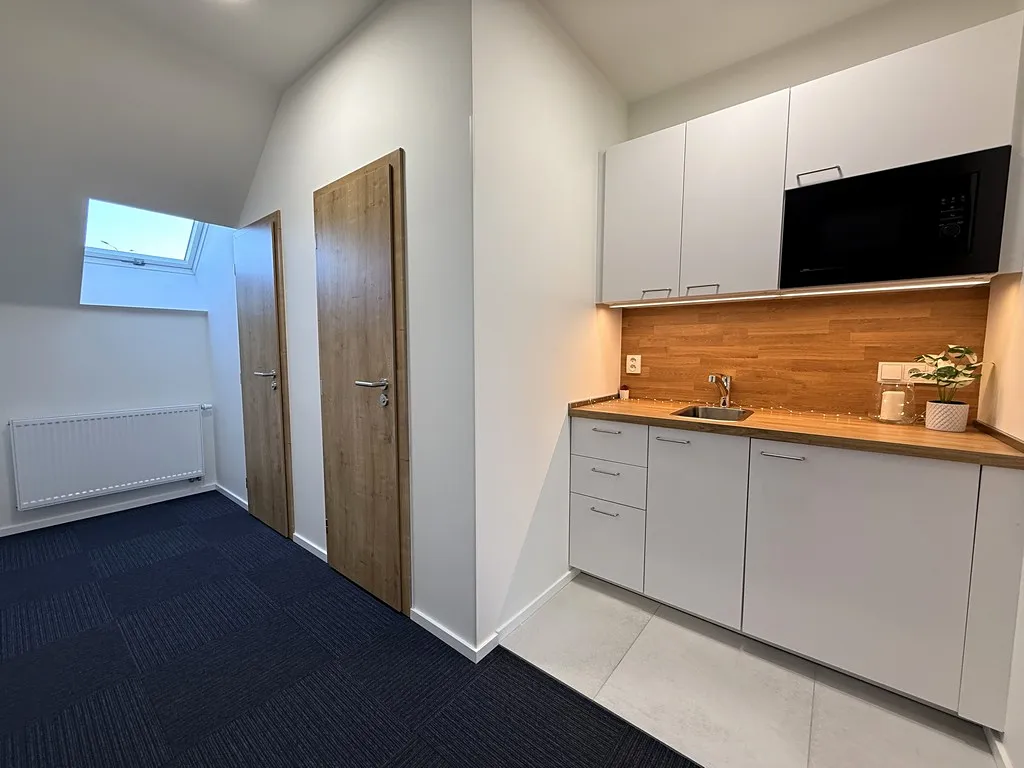 Ve vstupní hale je ideální místo pro sedačku s konferenčním místem, ale může tam také sedět například recepční či zde může být umístěn sekretariát. Kuchyňka o výměře cca 1,60m2 je vybavena lednicí, mikrovlnnou troubou a spoustou úložného prostoru. WC jsou samostatné, každé vždy s umyvadlem o výměře cca 1,26m2 a cca 2,11m2. Chodba vedoucí do jednotlivých místností má výměru cca 23,70m2. Kanceláře jsou samostatné, celkem je jich osm. Každá je vybavena klimatizací značky Sinclair, která chladí i topí. Místnosti jsou poměrně veliké a jejich výměra činí cca 12,94m2, cca 12,84m2, cca 12,76m2, cca 11,70m2, cca 14,90m2, cca 11,06m2 a 2x 12,08m2. Na konci chodby je samostatná místnost o výměře cca 3,10m2, která může sloužit jako úklidová místnost, archiv, ale i jako serverovna.