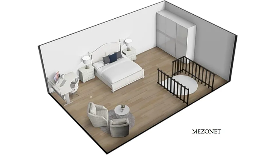 Za vchodovými dveřmi se ocitneme v prostorné chodbě (cca 3,14 m2), ze které je vstup do velké koupelny (cca 2,65 m2). Koupelna s WC je vybavena umyvadlovou skříňkou, umyvadlem, velkým zrcadlem, WC a sprchovým koutem. Hlavní dominantou bytu je pokoj s kuchyňským koutem (cca 24,10 m2), který disponuje novou kuchyňskou linkou, jejíž součástí je digestoř, elektrická trouba, elektrická sklo-keramická deska a pračka. Lednička s mrazákem zde není, ale majitel v případě zájmu lednicí s mrazákem byt dovybaví. V tomto pokoji je také široké točité schodiště vedoucí do mezonetu, kde je pokoj (galerie) o výměře (cca 21,39 m2) s přiznanými trámy a střešním oknem. V místnosti je klimatizace značky LG, která chladí i vytápí. V přízemí nesmíme opomenout ani další samostatný pokoj (cca 13,21 m2), který může sloužit jako obývací, ale i jako ložnice.