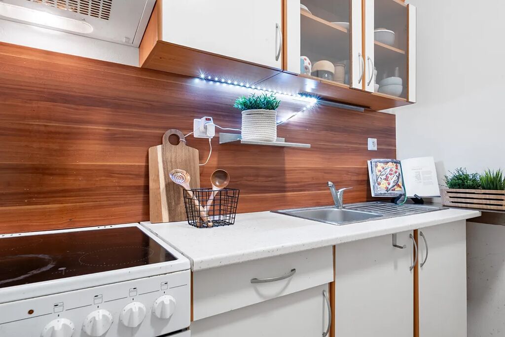 Díky vysokým stropům je prostor efektivně využit díky mezoninovému spaní. Na podlahách je dlažba a plovoucí podlaha. Vytápění i ohřev vody zajišťuje elektrický kotel.