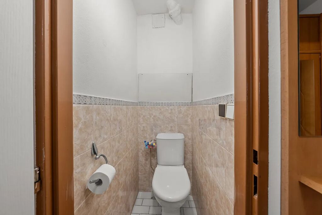 Podlahy tvoří plovoucí podlaha vyjma koupelny a WC, kde je dlažba.