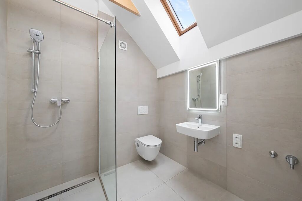 Schody se dostanete do patra, projdete podél „chill zóny“ a máte před sebou troje dveře - do dvou ložnic a do koupelny se sprchovým koutem.