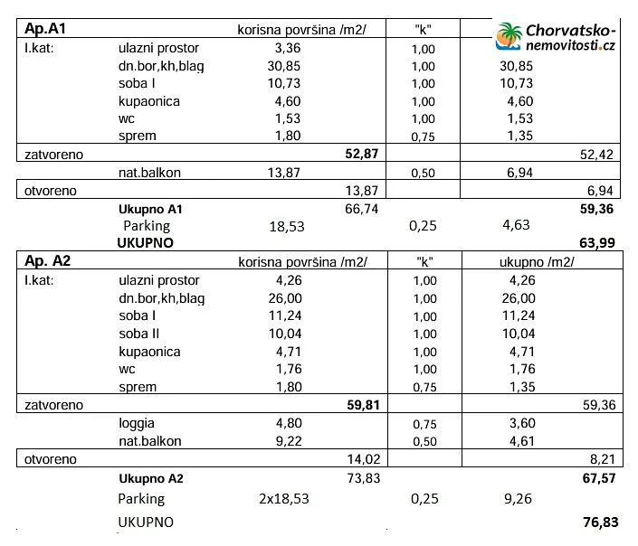 Na prodej byt 2+1 (A1) o celkové ploše 63.599 m2 v prvním patře novostavby v Novalji
