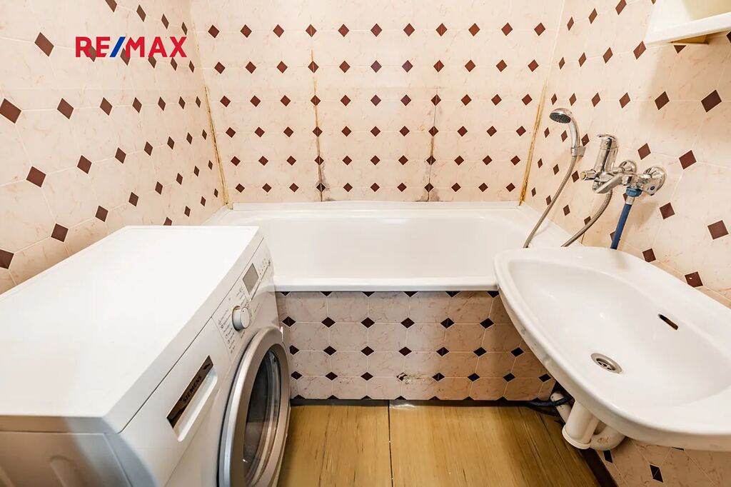 Koupelna je vybavena vanou a umyvadlem, toaleta je řešena samostatně. Součástí bytu je také prostorná předsíň s vestavěnými úložnými skříněmi.
