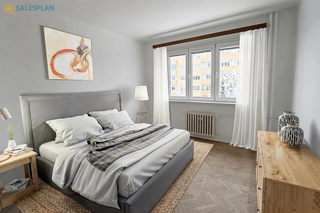 Byt v osobním vlastnictví je umístěn v pátém nadzemním podlaží domu s výhledem do zeleně. Jednotka je v původním stavu, vyklizena a připravena k rekonstrukci. Podlahovou krytinou jsou zachovalé parkety, které po renovaci mohou být zajímavým designovým prvkem. Dispoziční řešení bytu je velmi efektivní. Místnosti jsou samostatné a neprůchozí. Skládá se z prostorného obývacího pokoje, ložnice a kuchyně. Koupelna a toaleta jsou řešeny samostatně. Nespornou výhodou je zasklená lodžie.