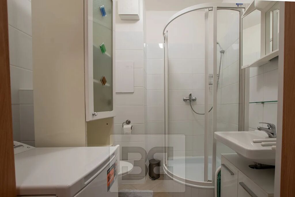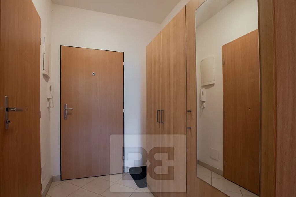 V bytě se také nachází prostorná předsíň se skříněmi a koupelna se sprchovým koutem a pračkou.