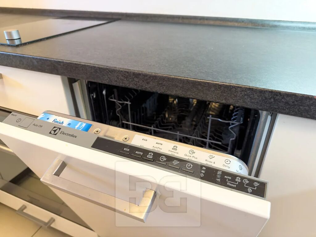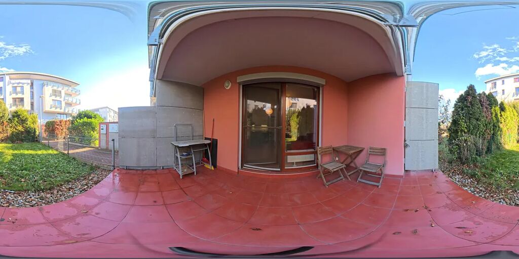 Dispozice bytu je prakticky řešená – obývací pokoj s kuchyňským koutem nabízí dostatek prostoru pro pohodlné bydlení. Kuchyňská linka je vybavena vestavnými spotřebiči včetně myčky nádobí. Velká francouzská okna zajišťují dostatek denního světla a přímý vstup na terasu a zahradu.
