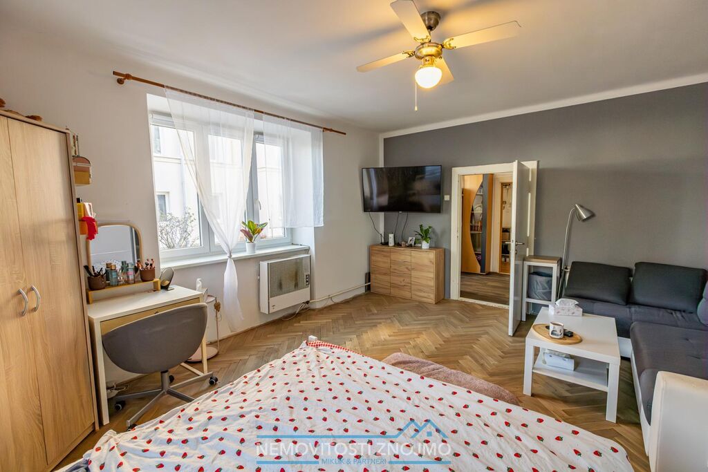 c.) hlavní místnost s postelí, rozkládací pohovkou a skříní