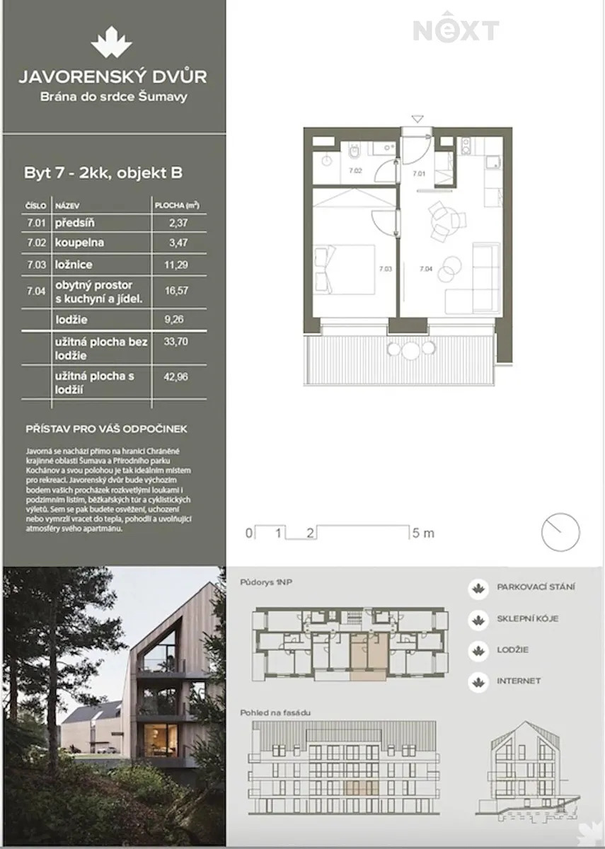 Celková plocha apartmánu je 35 m². Patří k němu prostorná lodžie o velikosti 9,26 m² s nádherným výhledem do okolní přírody. V ceně je i sklepní kóje (2,2 m²) a venkovní parkovací stání.