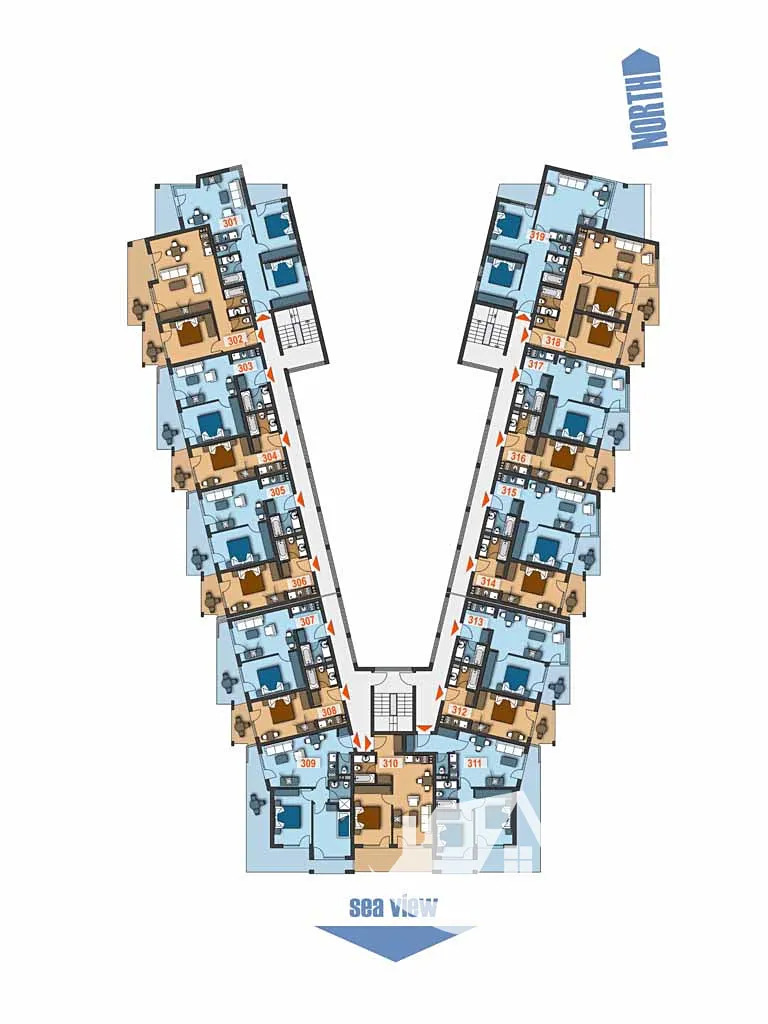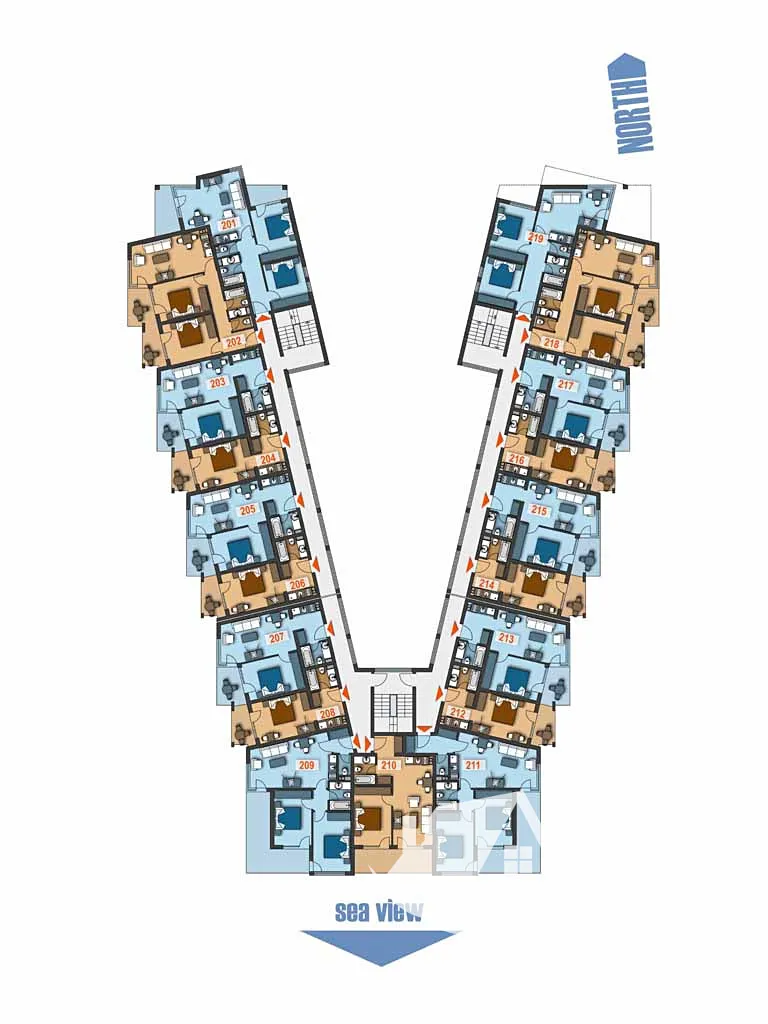 Apartmán o velikosti 63,93 m² se nachází v 1. patře, orientovaný na východ s krásným výhledem na moře. Prodává se ve fázi hrubé stavby – omítky, rozvody, elektroinstalace, vstupní dveře a plastová okna Winkhaus. Nabízíme možnost dokončení na klíč podle vkusu klienta. Fotografie interiérů slouží jako inspirace.