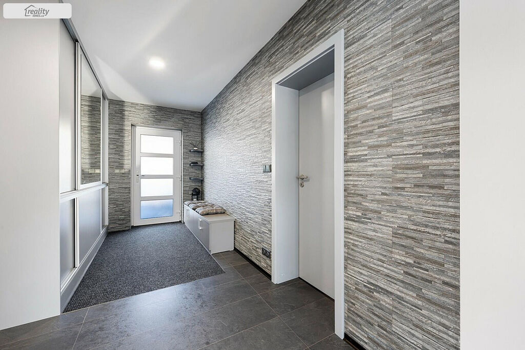 zádveří, chodba, ze které můžete vstoupit do obývacího pokoje s kuchyní, ložnice , koupelna s WC, pracovna a další WC
