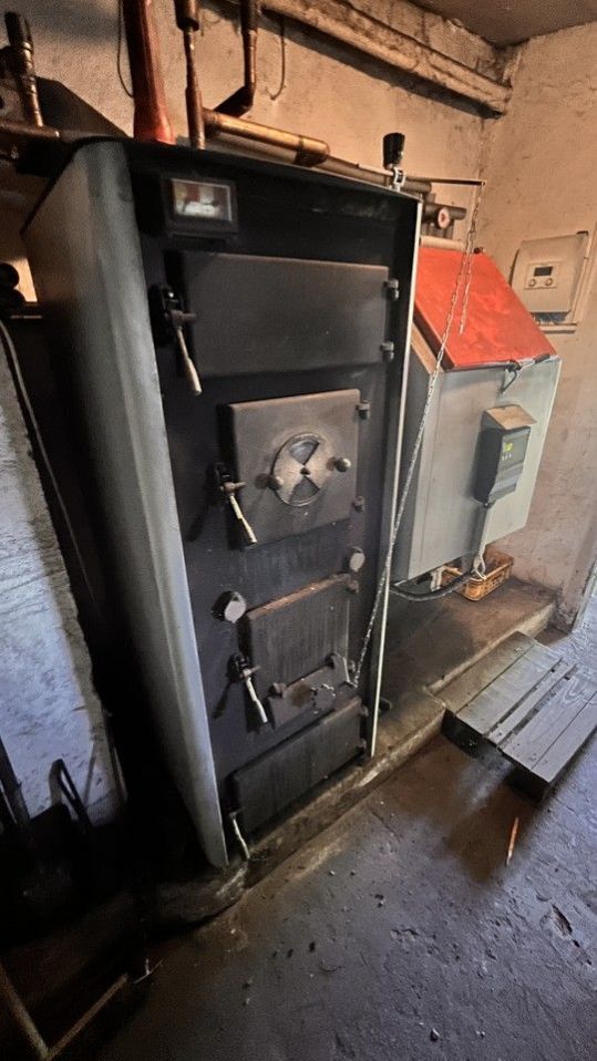 V zadní části přízemí je umístěn automatický kotel na tuhá paliva se zásobníkem. Odpad je řešen pomocí septiku.