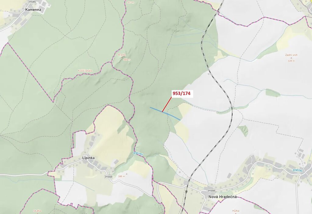 Lesní pozemek o výměře 6275 m2, parcelní číslo 953/174, podíl 1/1, katastrální území Nová Hradečná, obec Nová Hradečná, obec s rozšířenou působností Uničov, okres Olomouc, Olomoucký kraj.