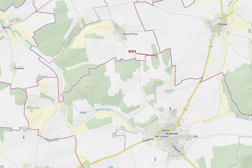 Lesní pozemek o výměře 703 m2, parcelní číslo 3063, podíl 1/1, katastrální území Koloveč, obec Koloveč, obec s rozšířenou působností Domažlice, okres Domažlice, Plzeňský kraj. Po těžbě.