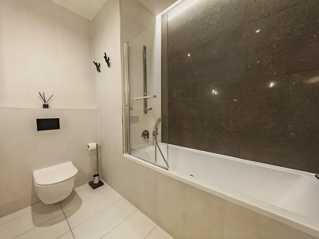 Největší předností je soukromá terasa/zahrada o výměře 50 m². K dispozici je plně vybavená kuchyň se spotřebiči včetně vinotéky, samostatné WC pro hosty a koupelna s vanou.