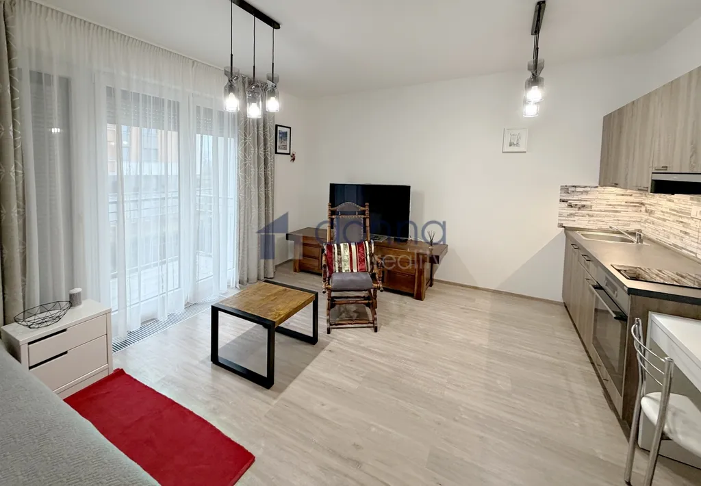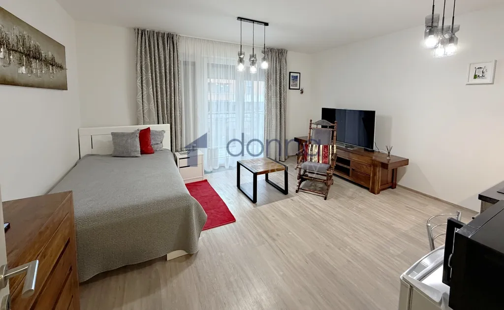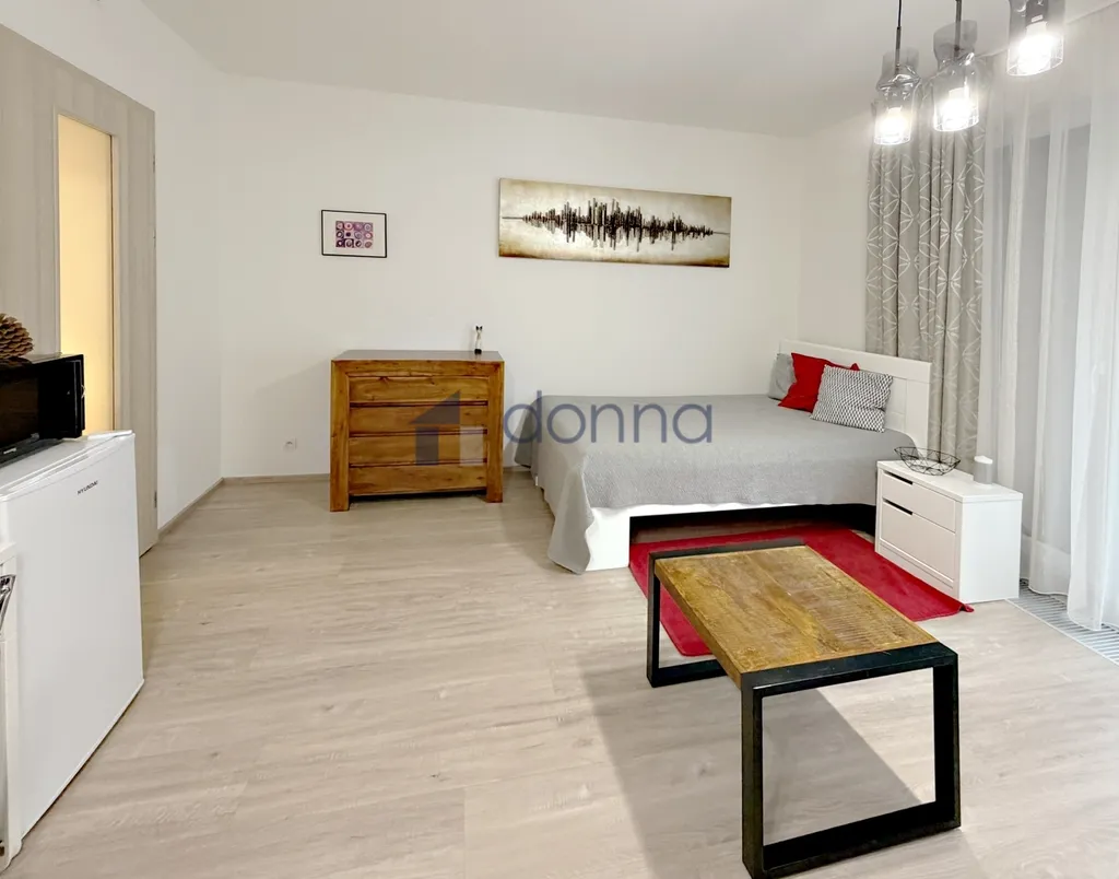 Chodba s šatními skříněmi, prostorný pokoj s balkonem, kuchyňským koutem, lůžkem, komodou a skříňkou s TV. Koupelna se sprchovým koutem, dále pračka se sušičkou a toaleta. Kuchyňská linka se spotřebiči (varná dvouplotýnka, pečící trouba, lednice, mikrovln. trouba), menší jídelní stolek. Bezpečnostní vchodové dveře, na oknech jsou nainstalovány el. předokenní rolety. V bytě je rekuperace.
