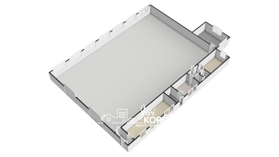 Hlavní hala má výměru 308 m² s rozměry cca 21,5 × 14,5 m, což poskytuje dostatek prostoru pro výrobu, skladování nebo lehký průmysl.
