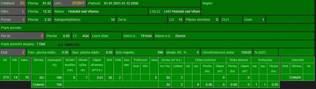 - p.č. 1689/122 vedená jako lesní pozemek o celkové výměře 23 149 m2, vlastníme podíl 1/8 tedy 2 894 m2 (stáří lesa 147 let - zastoupení dřevin smrk, borovice, stáří lesa 109 let - zastoupení dřevin borovice, smrk, stáří lesa 92 let - zastoupení dřevin borovice, smrk, stáří lesa 18 let - zastoupení dřevin borovice)