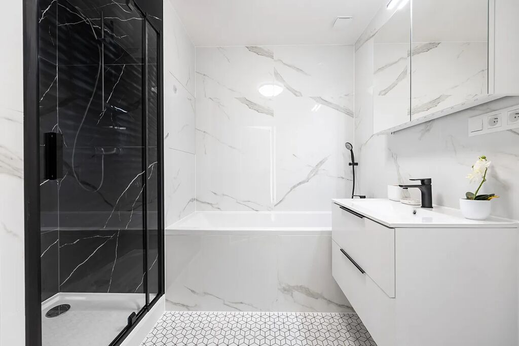 - nová sanita (vana, sprchový kout, umyvadlo, skříňka, toaleta)