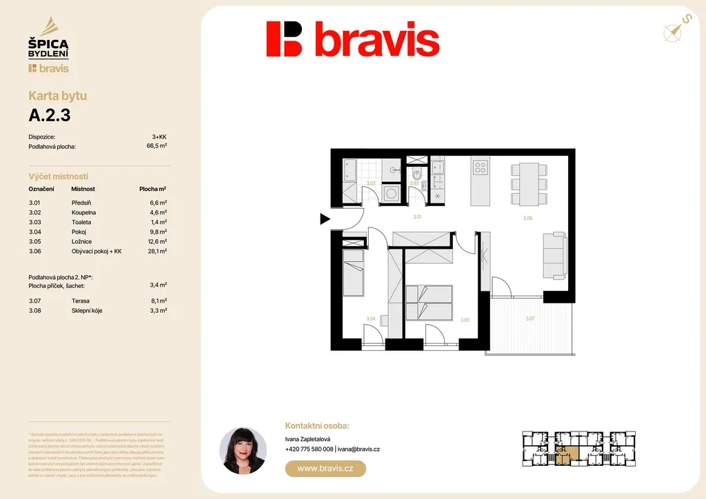 Nabízíme exkluzivní bytovou jednotku 3+kk (bytová jednotka A2-3) v novém projektu Špica bydlení — byt umístěný ve 2. NP nízkoenergetického bytového domu A. Celková podlahová plocha činí 66,5 m2 s balkonem 9,3 m2, sklepem 3,3 m2 a vlastní parkovací stání, to vše v ceně bytu.