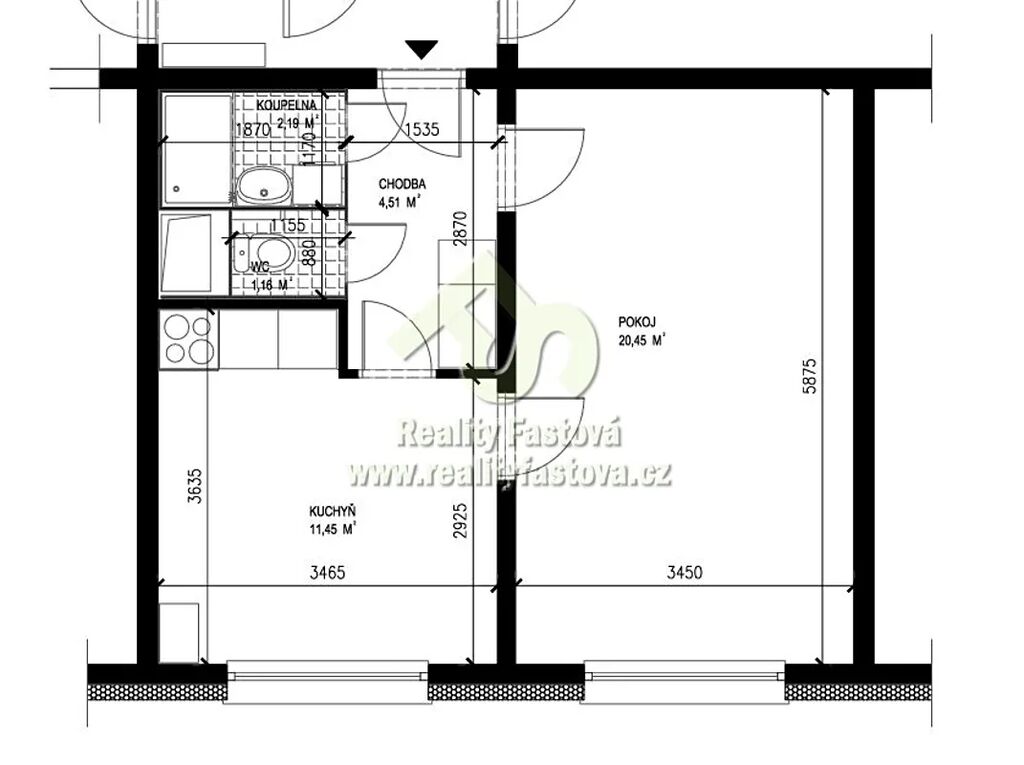 Dispoziční řešení - vstupní chodba, kde jsou vestav.botní a šatní skříně, vpravo koupelna se sprchovou vaničkou a umyvadlem a samostatné WC. Dále má byt prostornou kuchyni a velký pokoj, který je nábytkem rozdělen na spací část a obývací pokoj. Tento byt je kompletně zařízen, sice starším nábytkem, vše je funkční a pečlivě a soustavně opečovávané.