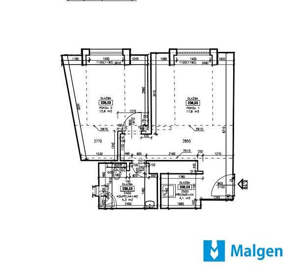 Dispozice bytu zahrnuje vstupní halu, koupelnu se vanou koutem a WC, plně vybavenou kuchyň (částečně oddělena) s obývacím pokojem a ložnice.